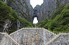 天門洞,位于天門山山體中部,是臺(tái)地邊緣的一個(gè)地下溶洞,因向斜構(gòu)造之力擠壓、坍塌、溶蝕,南北兩端巖層崩落,裸露天門。天門山古稱嵩梁山,三國吳永安六年(263年),山體忽然峭壁洞開,玄朗如門,形成迄今罕見的世界奇觀——天門洞。吳帝孫休認(rèn)為這是吉祥征兆,于是易嵩梁山為天門山。天門洞高131.5米,寬57米,深60米,南北對(duì)開千尋素壁之上,扶搖而通天,氣象變化萬千,似明鏡鑲嵌于蔚蔚天幕之上,終年白云紫霧,是世界罕見的高海拔天然穿山溶洞。著名學(xué)者黃錦祥曾賦詩《游天門山》一首:“絕壁千峰萬仭哉,迂回棧道上云臺(tái)。天門霧鎖晴還雨,洞宇彌煙撥不開。”這首贊美張家界的詩句至今被廣泛傳誦。