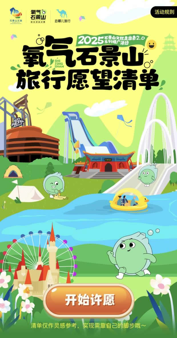 在“去哪兒”旅行APP上線“氧氣石景山”文旅專題頁,不僅整合酒店榜單、景區(qū)門票、優(yōu)質(zhì)攻略等核心文旅資源,更特別設(shè)置石景山區(qū)對口支援和協(xié)作地文旅產(chǎn)品版塊,實(shí)現(xiàn)“石景山推廣+支援地區(qū)助銷”雙重價值。同步推出的“旅行打卡愿望清單”H5,線上用戶可點(diǎn)亮自己的石景山旅游心愿,生成專屬旅行愿望清單;在高校路演活動中,大學(xué)生可分享H5到社交媒體作為參與活動的入場券——既為高;顒宇A(yù)熱,更成為高校路演入場憑證,串聯(lián)起“線上互動-線下參與”的閉環(huán)。