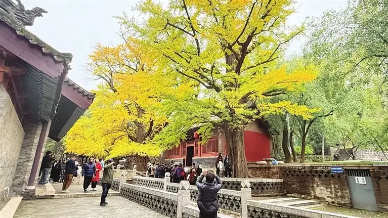 據(jù)工作人員介紹,這兩株枝干相依的古銀杏不僅是“資深網(wǎng)紅”,更是承載歷史的“活文物”。它們歷經(jīng)500年風(fēng)雨,至今枝繁葉茂,每年深秋都會(huì)如期換上“黃金盛裝”,與圣母殿、魚沼飛梁等著名古建筑共同構(gòu)成一幅動(dòng)人的秋日畫卷。